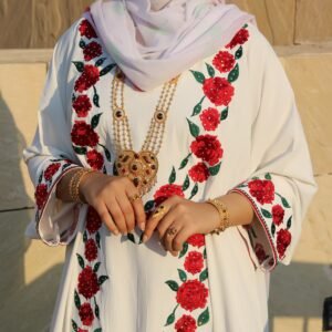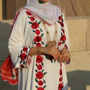 ثوب مزُيّن بخياطة ورود حمراء مستوحاة من وردة السلطان قابوس، ليجسّد نقاء اللون وسمو الرمز في تصميمٍ يعكس الأصالة والرقي، للتفصيل والطلبات الخاصة، يُرجى التواصل عبر رقم الواتساب