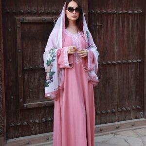 ثوب كلوش يجمع بين الراحة والانسيابية متوفر باللونين الأزرق والوردي، مع الغدفة الخاصة به من كولكشن وردة الجبل الأخضر، لإطلالة أنيقة مستوحاة من الطبيعة، للطلب على رقم الواتساب