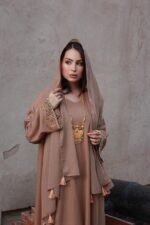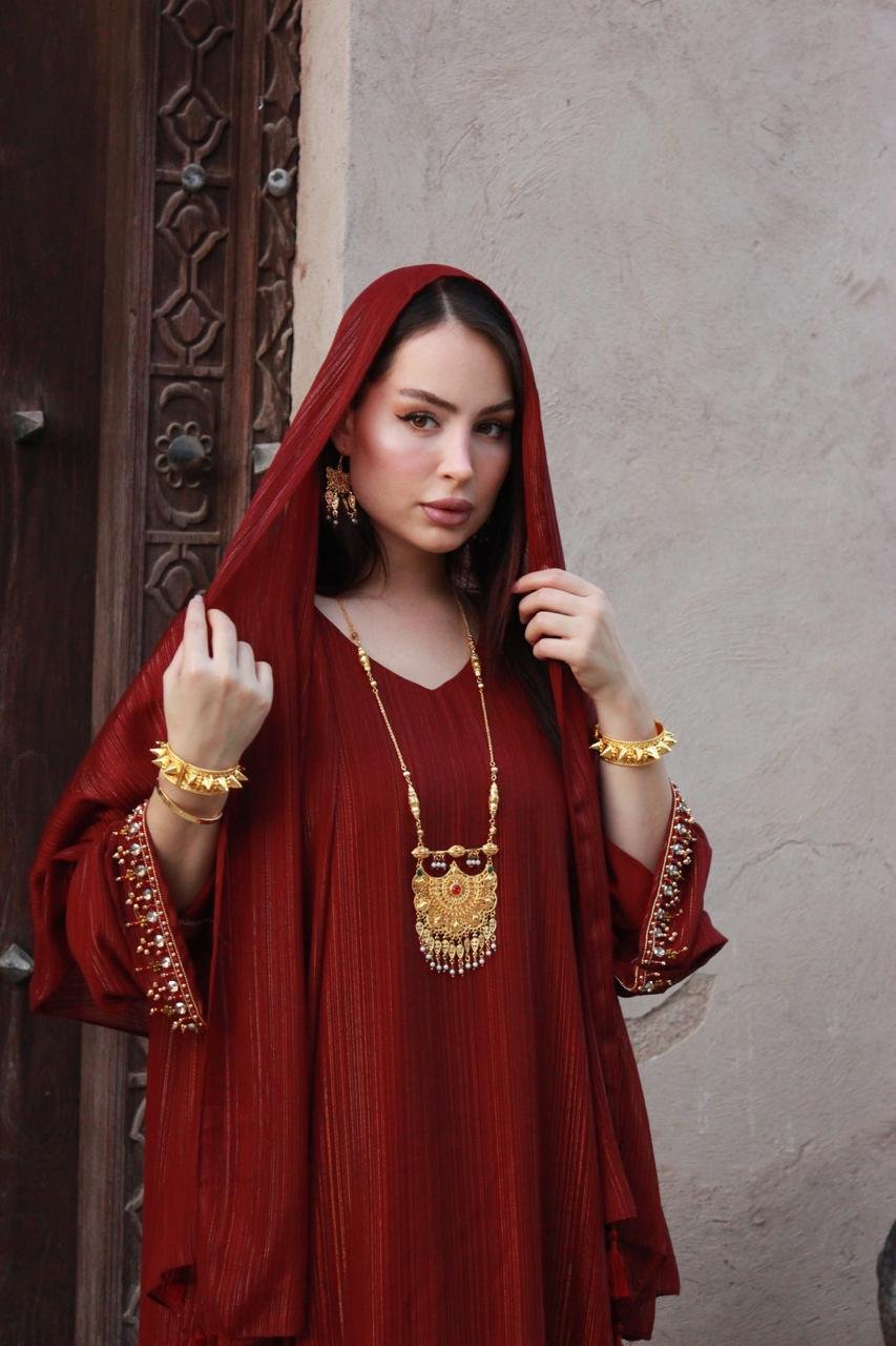 بخياطة شك (شغل يدوي) متقنة على الأكمام، باستخدام أفضل أنواع الخرز لإضفاء لمسة فاخرة تبرز جمال التصميم وأناقته، متوفر فقط باللونين الذهبي والعنابي، للطلب يرجى التواصل على رقم الواتساب
